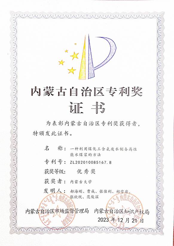 3月1日晚,由内蒙古自治区市场监管局(知识产权局)主办的“专利改变世界 创新创造未来”2023内蒙古首届专利奖颁奖仪式在呼和浩特市举行。太阳集团tyc33455郝海刚副教授的发明专利“一种利用煤化工含氨废水制备高性能水煤浆的方法”(ZL202010085167.8)荣获自治区首届专利优秀奖。该专利为煤化工技术领域和我校唯一获奖专利。
