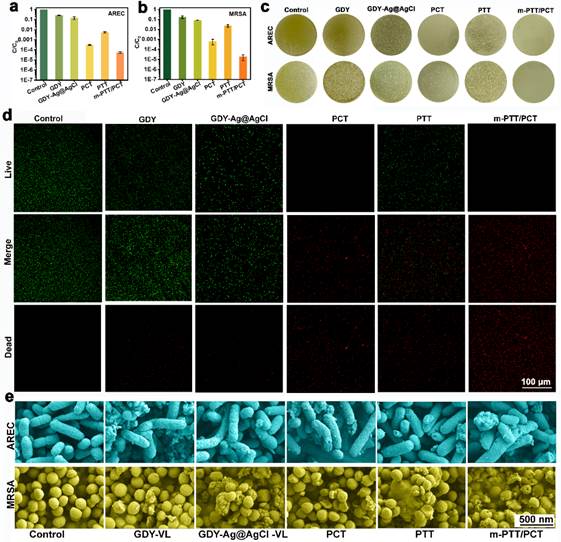 抗菌实验验证了GDY-Ag@AgCl的抗菌活性可以通过PTT对PCT的促进作用得到增强。m-PTT/PCT组对耐氨苄西林钠大肠杆菌(AREC)和MRSA抗菌效率可以降低4.5和4.8个数量级,显著高于其他实验组(图2a-c)。通过活/死染色细菌染色和SEM(图2d-e)观察对上述结果进行验证,发现相对于对其他实验组m-PTT/PCT组菌膜破损最严重。