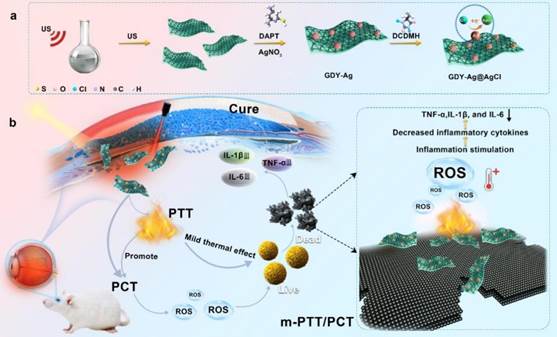 图 1. (a)GDY-Ag@AgCl合成示意图;(b)GDY-Ag@AgCl用于m-PTT/PCT治疗细菌性角膜炎的示意图。