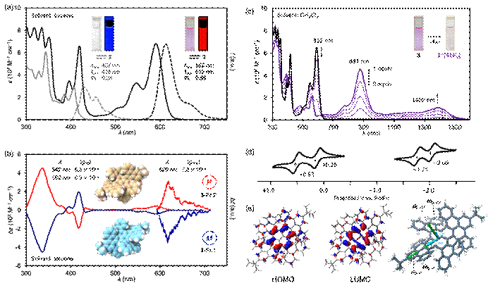 该论文的作者们成功合成了一种含有双重扭曲和四重螺旋骨架的多重螺烯,该分子在红光区具有高摩尔吸光系数,高发光效率等优秀的光学性质(图a)。更为重要的是经过实验和理论研究发现,其四重螺旋单元的主要作用是固定双重扭曲手性骨架,而正交于芘的双扭曲结构才是真正影响其手性光学性质的核心因素(图b和e)。同时,该分子还有2e–的接受/释放能力,表现出稳定的氧化还原特性(图d)。对其进行化学氧化可产生稳定的自由基阳离子,其吸收光谱涵盖了近红外I区和II区(图c)。