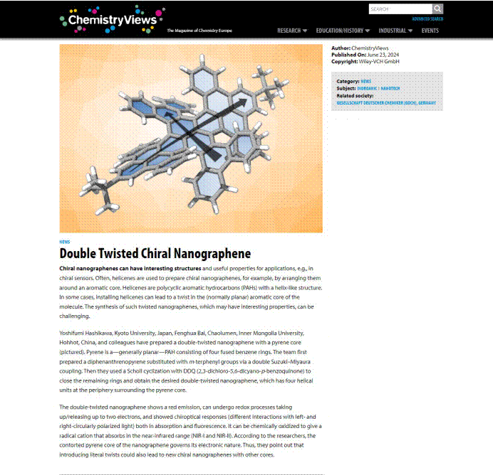 该研究成果一经刊出即被国际权威学术新闻媒体ChemistryViews作为亮点推介https://www.chemistryviews.org/double-twisted-chiral-nanographene/。
