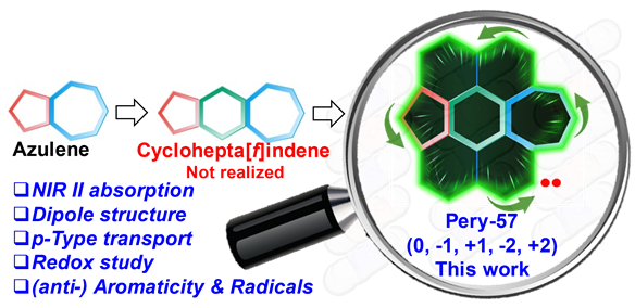 鉴于此,王青研究员团队成功合成了一个“类azulene”型缺陷型稠环芳烃分子Pery-57。此分子可以看作是将明星分子perylene嵌入于azulene的两个缺陷环中间,从而得到了两个缺陷环均位于分子外围的“类azulene”结构。由于此独特的结构特征,分子Pery-57表现出大分子偶极矩、分子内电荷分离、全局芳香性、酸响应、紧密的分子堆积、近红外二区吸收等性能;不仅如此,Pery-57的氧化还原行为也很有趣:它的阳离子自由基可以快速夺取氢原子,并且在低温下表现出可逆的二聚行为;它的二价阴离子具有明显的全局反芳香性与单线态双自由基基态等特点。除此之外,“类azulene”结构的存在也使得该化合物为构筑高效电荷传输材料提供了新的可能。