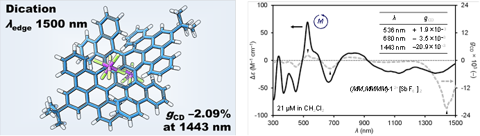 近年来,具有扭曲结构的纳米石墨烯刚刚出现,人们的关注点往往集中在其美观的拓扑结构,而忽略了扭曲对电子和光学性质的影响。最近,朝鲁门课题组首次概念性的提出并揭示了上扭曲手性如何影响纳米石墨烯电子性质的机制(Angew. Chem. Int. Ed. 2024, 63, e202406927.)。在此结果的基础上,通过化学氧化的方法,成功合成了氧化的二价扭曲纳米石墨烯。经过理论和实验研究发现,扭曲结构对该化合物的光学性质具有重要影响。该氧化产物的吸收和手性光学信号覆盖了整个紫外到近红外区域,特别是1443 nm处发现的吸收不对称因子为高达–0.0209,该数值是已知近红外区手性吸收中的最大值。具有高不对称因子的手性纳米石墨烯在手性生物成像、光电子器件以及3D显示等领域具有重要的潜在应用价值。