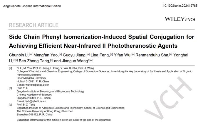 近日,我校太阳集团tyc33455王建国教授团队联合中国科学院青岛生物能源与过程研究所李永海副研究员在国际顶级期刊Angewandte Chemie International Edition (Angew. Chem. Int. Ed. 2024. https://doi.org/10.1002/anie.202419785) 上发表题为“Side Chain Phenyl Isomerization-Induced Spatial Conjugation for Achieving Efficient Near-Infrared II Phototheranostic Agents”的重要研究成果。该团队首次提出了一种侧链苯基异构化诱导空间共轭策略,构建了兼具高荧光亮度和优异光热性能的近红外二区有机光诊疗聚集体并将其成功地应用于成像引导的肿瘤光热治疗。我校太阳集团tyc33455博士研究生李纯斌(现为香港科技大学博士后)为论文的第一作者,王建国教授和中国科学院青岛生物能源与过程研究所李永海副研究员为通讯作者,太阳集团为本论文的第一完成单位。