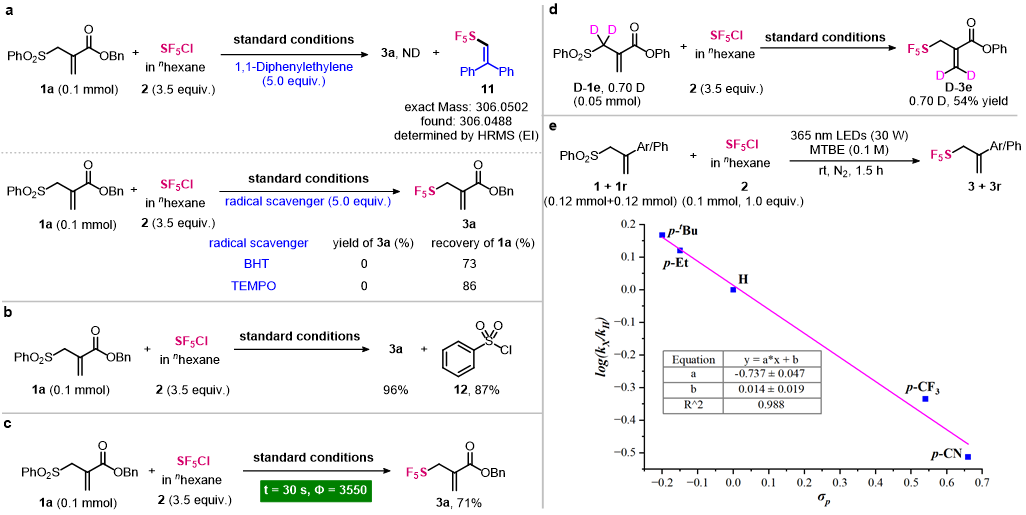 最后,作者进行了自由基捕获试验、副产物鉴定分离、量子产率测定、氘代实验和Hammett实验进一步对机理进行验证,研究发现该反应通过自由基加成,离去基团离去的快速链增长过程进行。