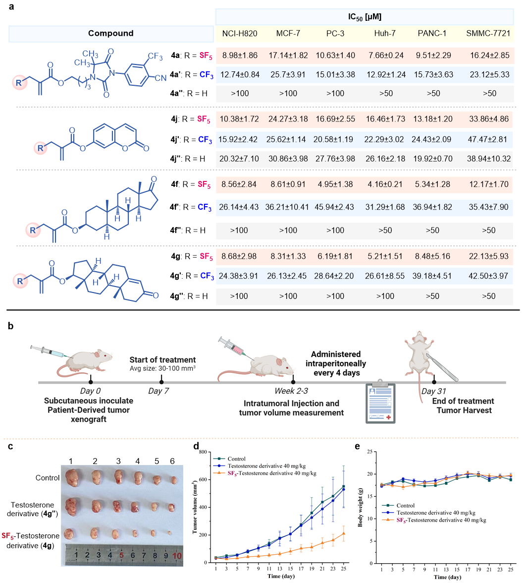 最后,作者对几个药物衍生的五氟硫基烯丙基进行了体外多种抗肿瘤细胞的研究实验中表现出优异的抗增殖活性,以及研究了化合物4f和4g对肺腺癌小鼠进行了体内抗增殖活性,一系列的机制研究表明,多种五氟硫基烯丙基化合物具有潜在的抗肿瘤活性,这一发现为含SF5基团的抗癌药物研发提供了重要线索。