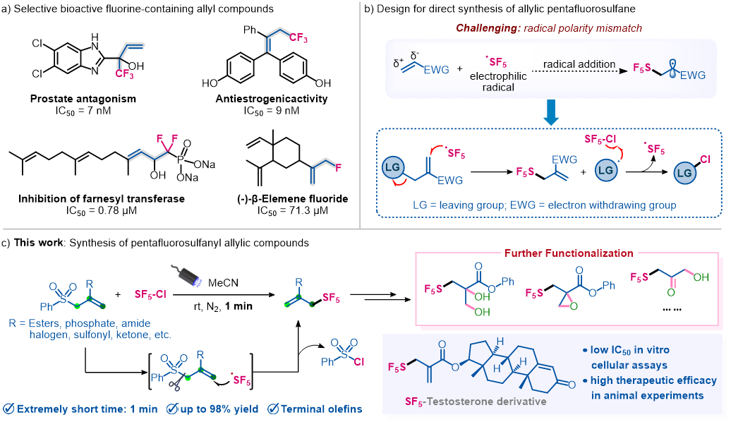 近日,我院郭硕课题组基于前期五氟硫基化学领域的研究成果(Nat. Commun. 2024, 15, 9705; J. Am. Chem. Soc. 2025, DOI: 10.1021/jacs.5c09085),与南开大学丁亚辉等人合作在《Science Advances》发表重要研究《A general leaving group assisted strategy for synthesis of pentafluorosulfanyl allylic compounds》。该研究团队开发了一种太阳光驱动下离去基团辅助的策略,成功实现了各类五氟硫基(SF5)烯丙基化合物的高效合成,值得注意的是,部分产物在体内体外抗肿瘤研究中均表现出优异的抗肿瘤活性。在该研究中,尽管强亲电性的五氟硫基自由基加成在吸电子取代烯烃末端具有自由基极性错误匹配问题,但研究者创新性地通过调控离去基团策略,成功实现了五氟硫基自由基的烯丙位引入,顺利合成了一系列取代的五氟硫基烯丙基化合物,这一突破填补了末端不饱和五氟硫基化学领域的研究空白,也为复杂含五氟硫基分子的模块化合成提供了全新方法。此外,基于可持续发展的考虑,作者还探究了在绿色光源驱动下即太阳光照射下五分钟即可获得较高分离收率的目标产物。最后,合成的含SF5烯丙基化合物在体内体外展现出优于临床药物的抗癌活性,同时一系列机理探究实验揭示反应机理,为同类反应设计提供理论框架,实现从合成方法到应用价值的闭环。