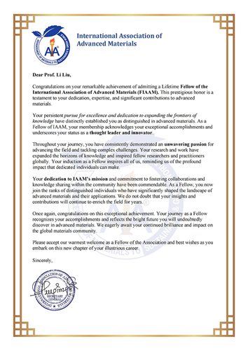 国际先进材料学会(IAAM)成立于2010年,总部位于瑞典斯德哥尔摩,是全球先进材料领域的权威学术组织,致力于为先进材料科学、工程和技术在世界范围内的快速发展提供一个高水平的学术平台。该学会的会员包括全球150多个国家的10万多名科学家。IAAM“终身会士”是全球范围内授予在材料科学、工程和技术领域做出独创性且重要贡献科研人员的殊荣,评选通过专家提名、学术委员评审、学术演讲等环节遴选产生。