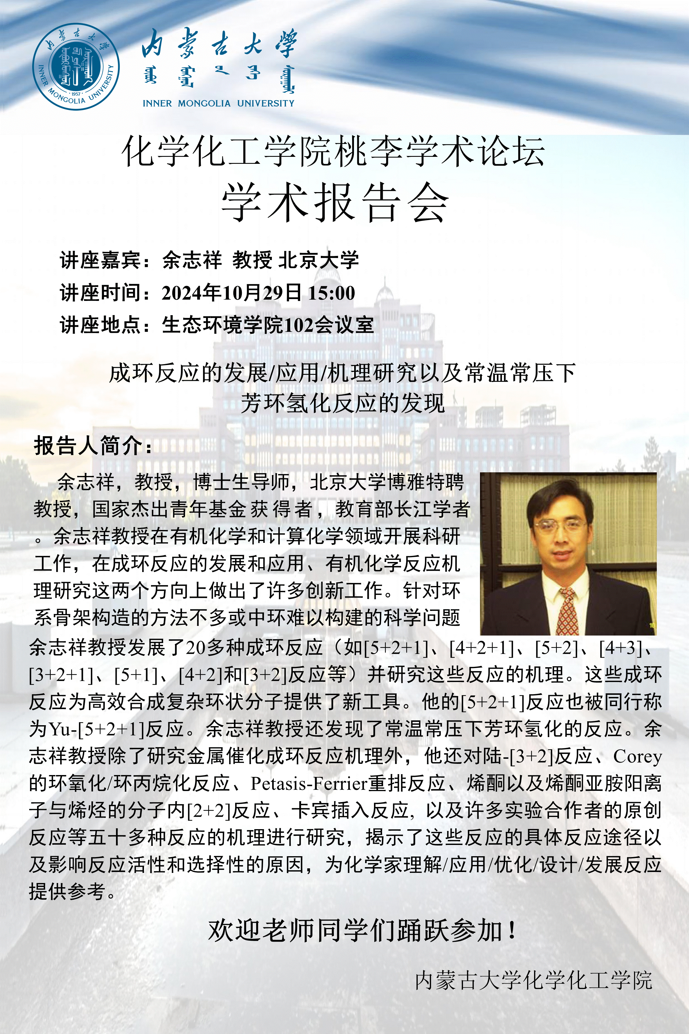 太阳集团tyc33455桃李学术论坛——成环反应的发展/应用/机理研究以及常温常压下芳环氢化反应的发现 余志祥教授北京大学