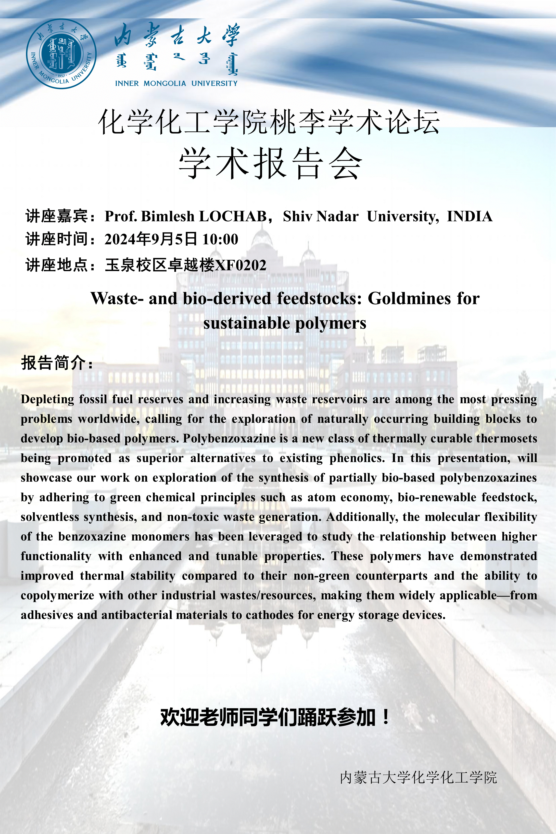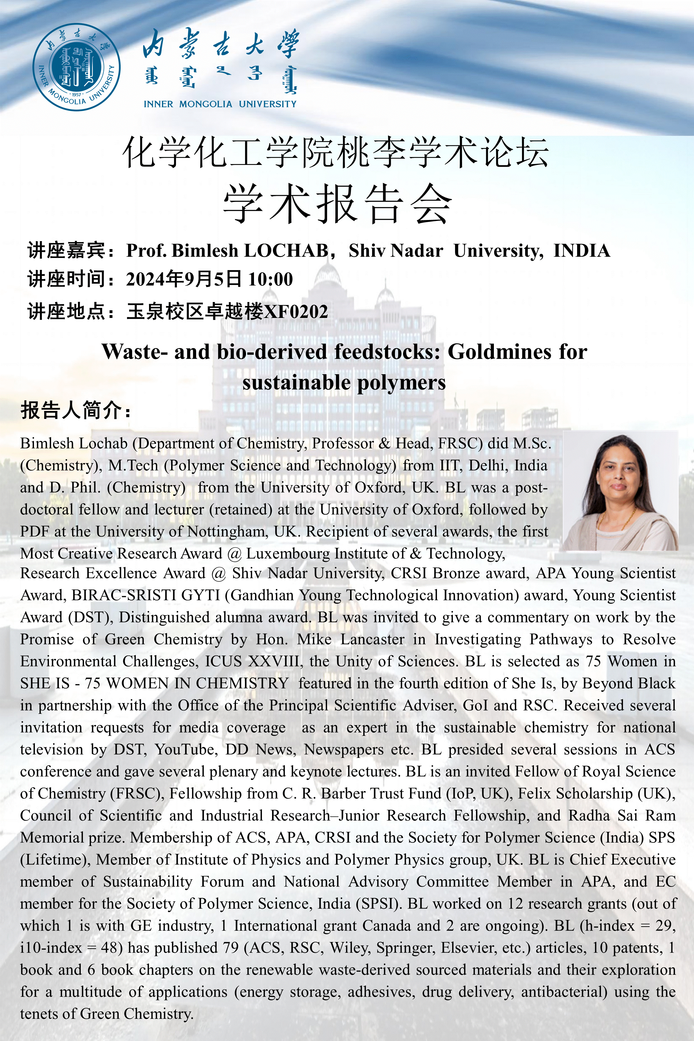 太阳集团tyc33455桃李学术论坛——Waste- and bio-derived feedstocks: Goldmines for Prof. Bimlesh LOCHAB,Shiv Nadar University, INDIA