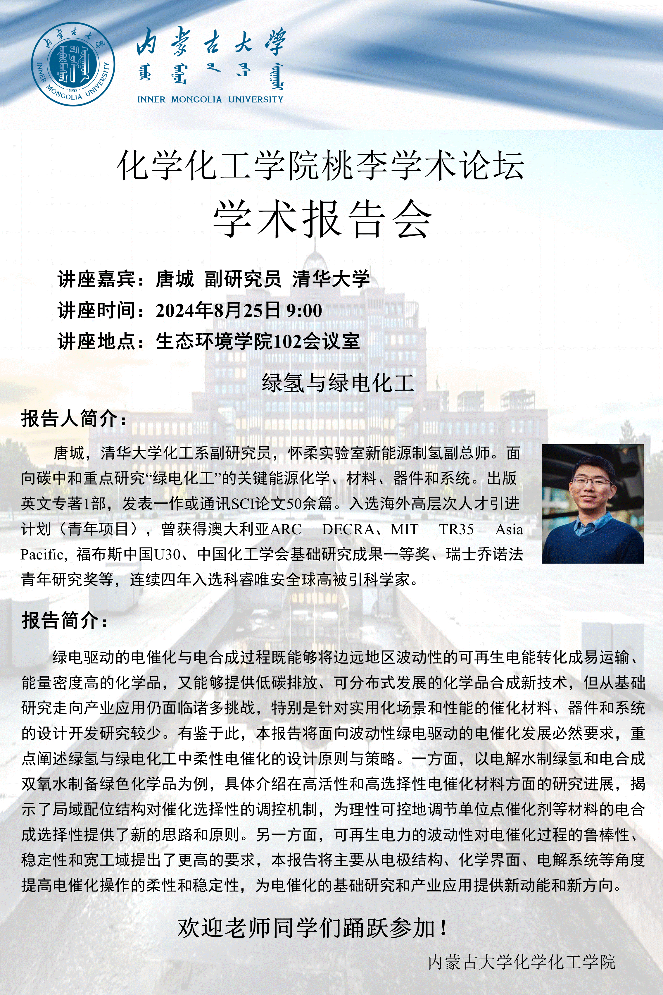 太阳集团tyc33455桃李学术论坛——绿氢与绿电化工 唐城 副研究员 清华大学