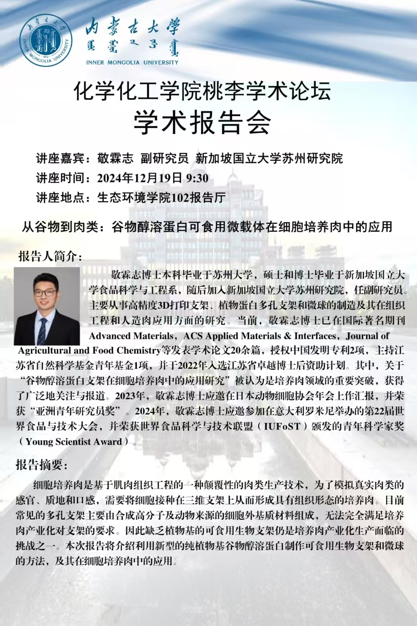 太阳集团tyc33455桃李学术论坛——从谷物到肉类:谷物醇溶蛋白可食用微载体在细胞培养肉中的应用 敬霖志 副研究员 新加坡国立大学苏州研究院