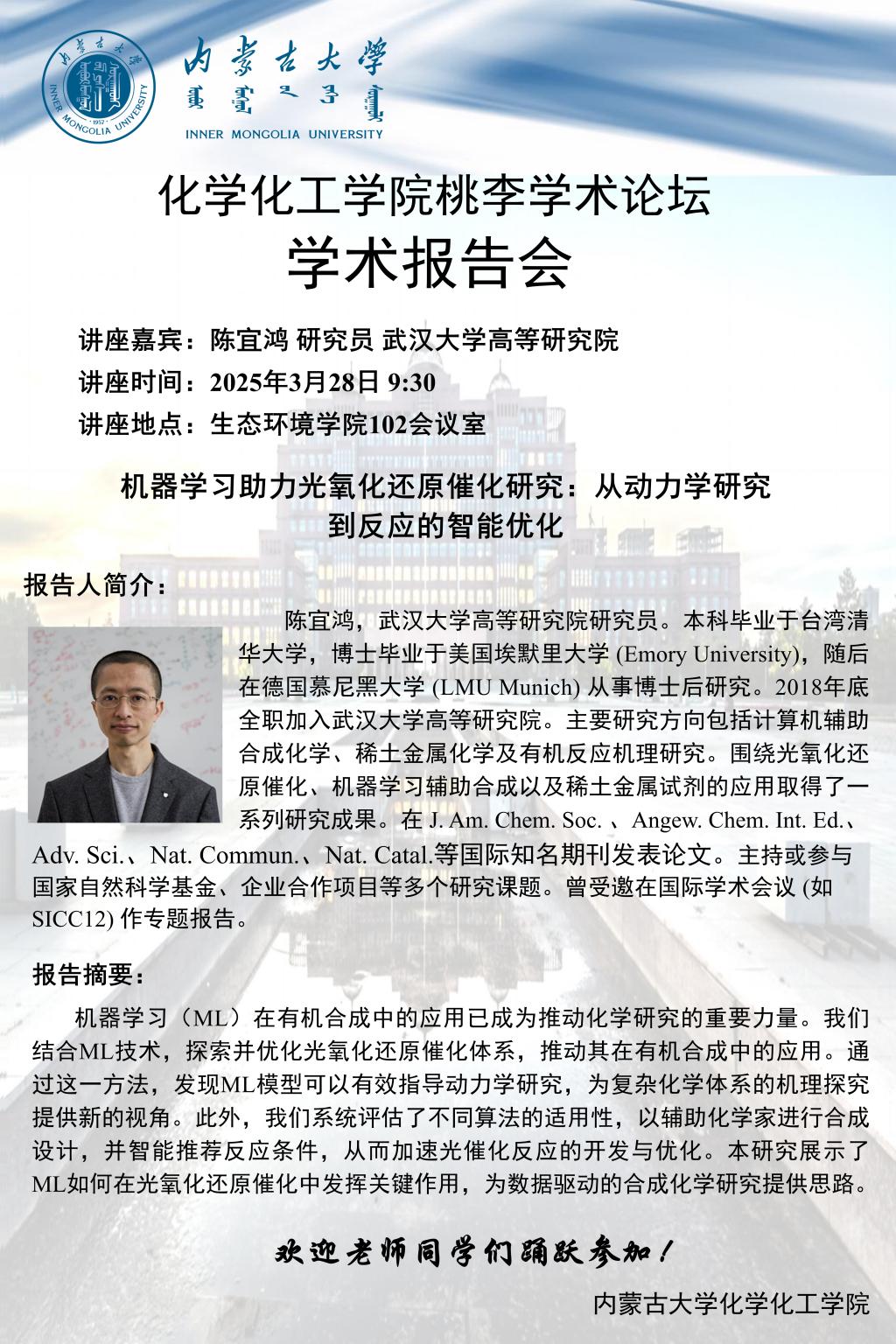太阳集团tyc33455桃李学术论坛——机器学习助力光氧化还原催化研究:从动力学研究到反应的智能优化 陈宜鸿 研究员 武汉大学高等研究院
