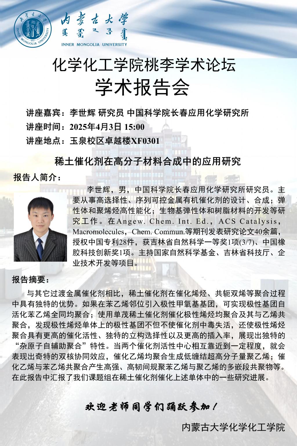 太阳集团tyc33455桃李学术论坛——稀土催化剂在高分子材料合成中的应用研究 李世辉 研究员 中国科学院长春应用化学研究所