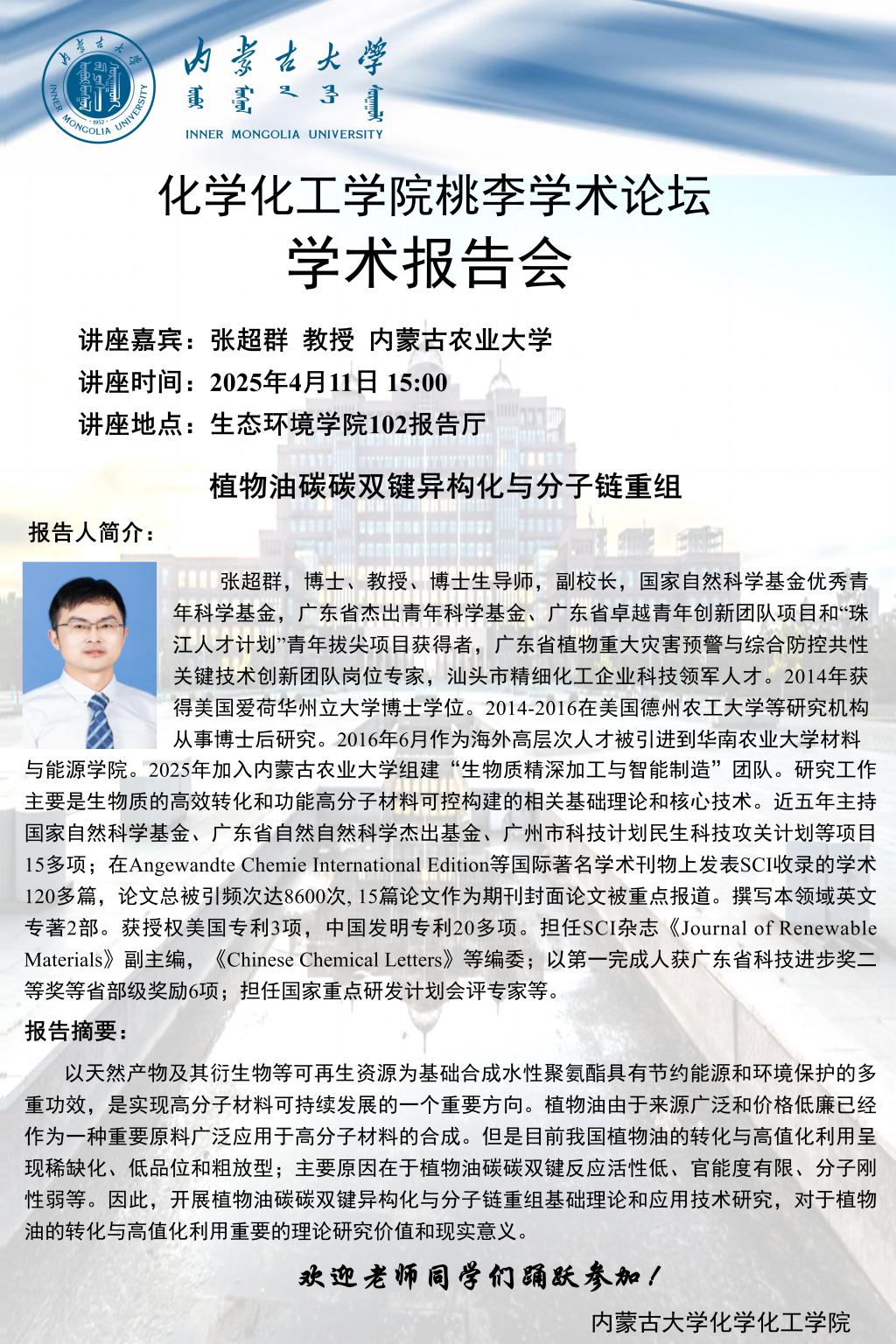 太阳集团tyc33455桃李学术论坛——植物油碳碳双键异构化与分子链重组 张超群教授 内蒙古农业大学