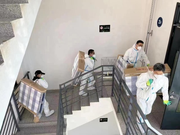 为了尽快解决学生转运所面临的住宿压力,学校紧急购买了一批折叠床以及床品物资。他们不顾自己长期奋战而导致的疲惫身体,扛着物资一趟又一趟地往返于楼下楼上进行搬运和安装。